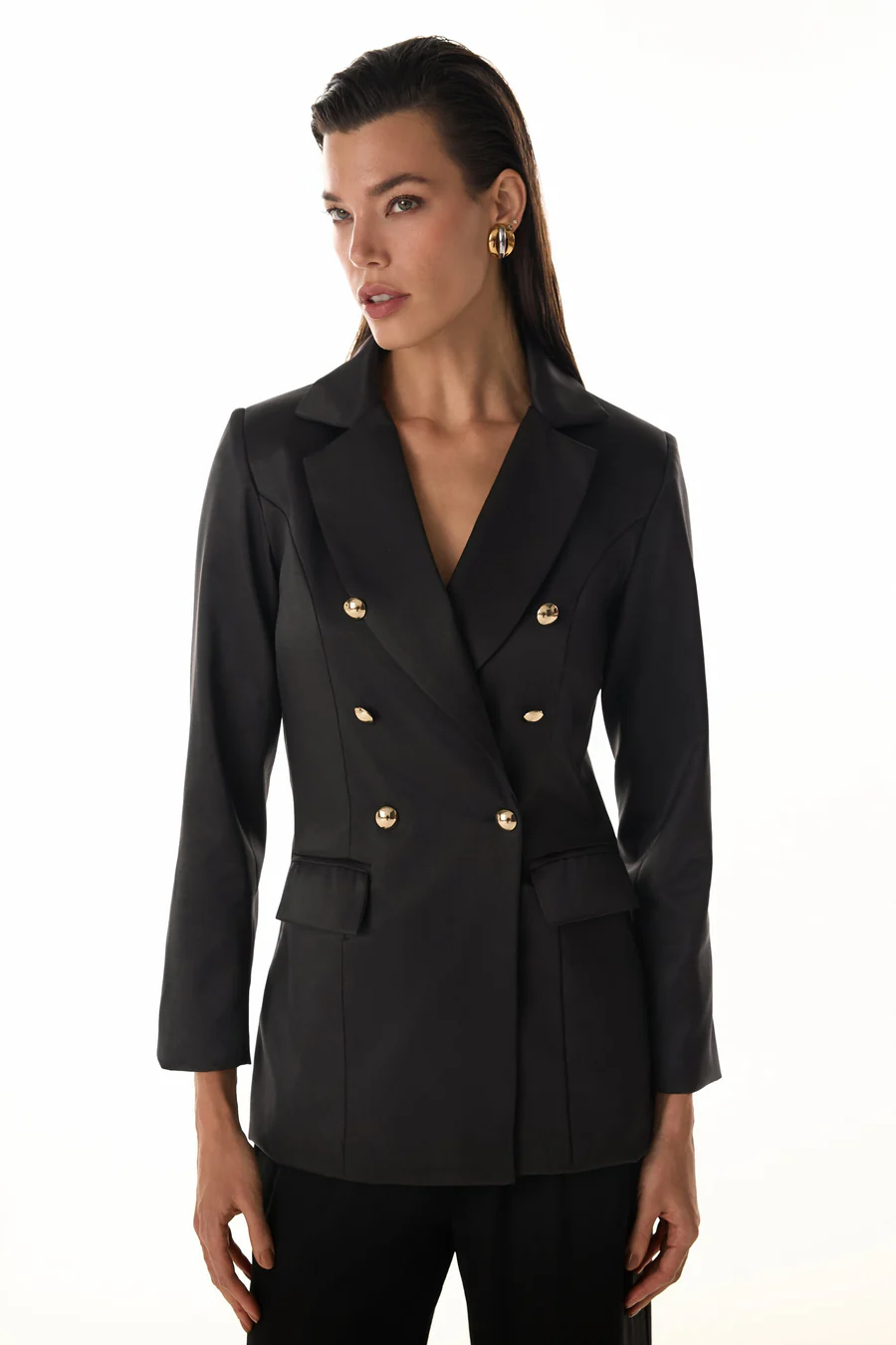Este Blazer Atemporal Fleche D'or traz uma alfaiataria refinada e moderna feita em tecido Cupro Peach Twill, ideal para quem busca elegância e conforto. Com ombreiras que garantem estrutura ao caimento, possui bolsos frontais funcionais que unem estilo e praticidade. A composição de 90% poliéster e 10% poliamida assegura durabilidade e fácil manutenção, tornando-o uma peça versátil para ambientes formais e ocasiões casuais sofisticadas.