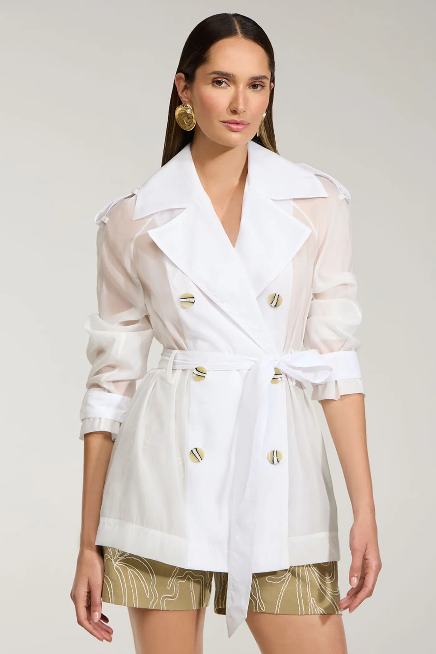 Parka Thamara Capelão confeccionada em organza off-white, um modelo contemporâneo que une leveza, sofisticação e informação de moda. A transparência elegante do tecido cria um visual fresh e moderno, perfeito para composições refinadas de verão e meia estação.