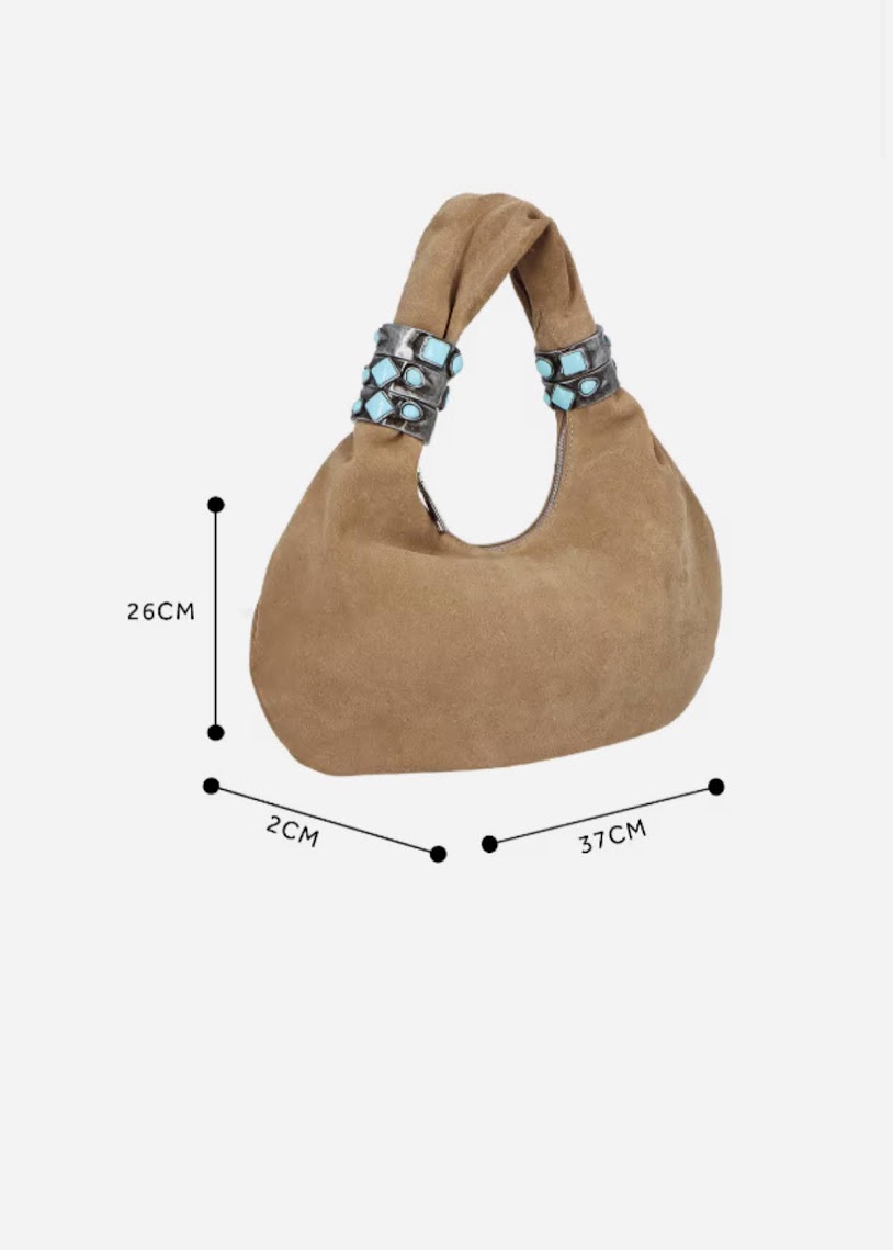 Bolsa Média em Camurça Bege Fendi com Argolas Metálicas e Aplicações Coloridas Luiza Barcelos - Com o estilo marcante de Thássia Naves e o design sofisticado de Luiza Barcelos, descubra a combinação perfeita entre o estilo boho sofisticado e a elegãncia dos acessórios de impacto. O grande detalhe são os aneis metálicos em tom grafite que envolvem a alça, adornadas com pedras no tom turqueza. Esses apliques criam um visual único, com uma inspiração étnica e um toque moderno. Perfeita para quem busca um acessório que seja ao mesmo tempo atemporal e statement.