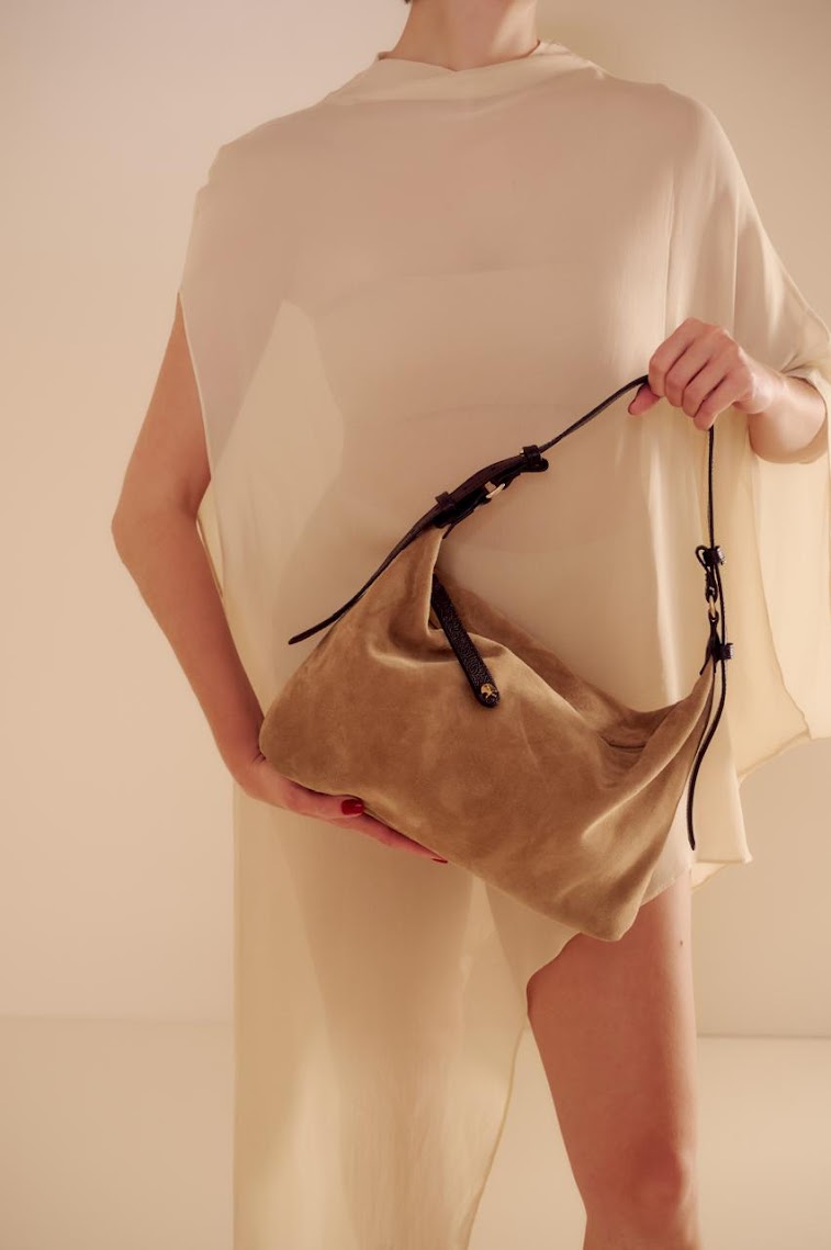 Bolsa Média em Camurça e Couro Luiza Barcelos - Com o estilo marcante de Thássia Naves e o design sofisticado de Luiza Barcelos, a bolsa grande em camurça no tom bege fendi com detalhes em couro liso preto traduz elegância e versatilidade. O contraste de texturas valoriza o design e ressalta a atemporalidade. O formato estruturado, com alça regulável, fechamento em zíper e detalhe metálico no puxador, acrescenta um toque luxuoso a qualquer produção.