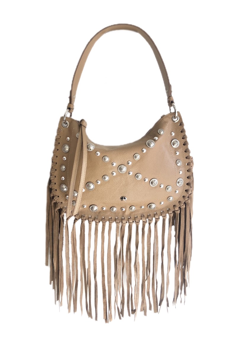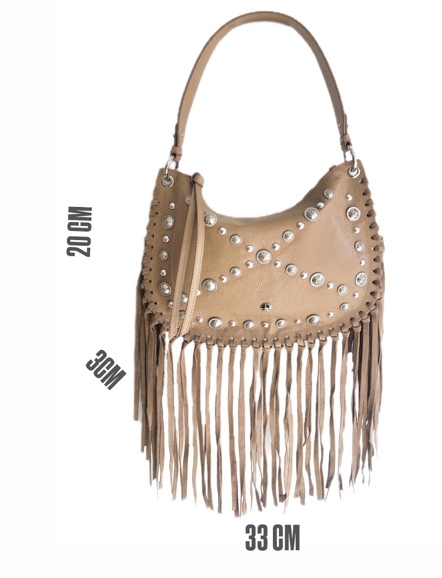 Bolsa Média em Couro com Franjas Aplicações Metálicas Luiza Barcelos - A bolsa média em couro mo tom fendi traz uma proposta marcante, com franjas longas e aplicações metálicas que adicionam atitude e movimento ao design. O mix de texturas e acabamentos valoriza o visual moderno e cheio de personalidade, enquanto a alça curta e a transversal removível garantem versatilidade no uso. Um acessório que combina autenticidade e estilo em cada detalhe.
