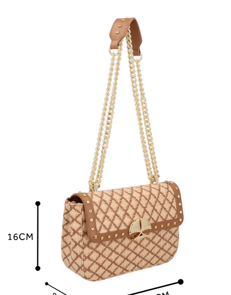 Bolsa Média em Couro e Palha com Alça de Corrente Luiza Barcelos - A bolsa média em couro e palha aposta em um design sofisticado com toque artesanal. O modelo apresenta trama em palha com padronagem geométrica e acabamento em couro, além de tachas metálicas aplicadas na aba que adicionam modernidade. A alça em corrente dourada garante elegância e versatilidade, resultando em um acessório que combina estilo, praticidade e charme natural.