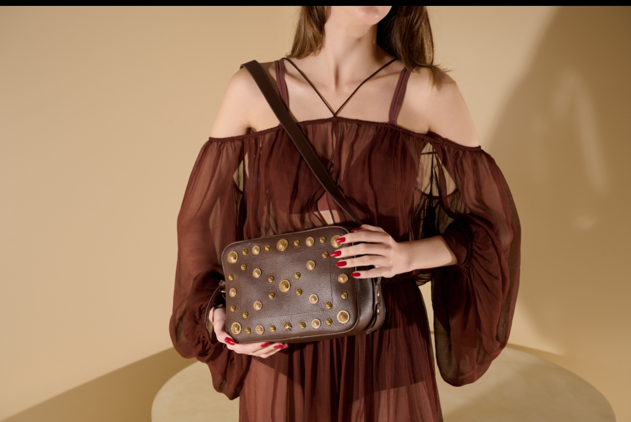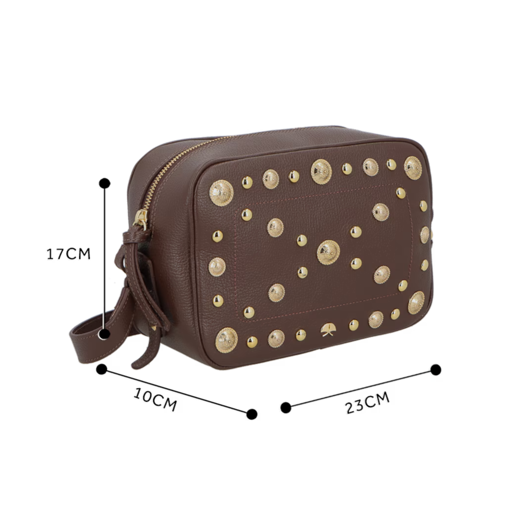 Bolsa Pequena em Couro com Aplicações Metálicas Luiza Barcelos - Essa bolsa pequena combina praticidade com estilo marcante. Seu design estruturado ganha destaque com as aplicações metálicas em diferentes tamanhos, criando um visual moderno e cheio de personalidade. O fechamento em zíper garante segurança, enquanto a alça de pulso adiciona versatilidade ao uso. Uma peça perfeita para trazer charme extra às produções.