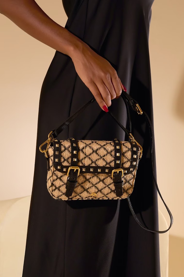 Bolsa Pequena em Couro com Detalhes de Tachas Luiza Barcelos - A bolsa combina palha tramada em desenho geométrico com detalhes em couro, criando um contraste sofisticado e atual. O acabamento é enriquecido por ferragens douradas e aplicações de tachas, que adicionam modernidade e atitude ao modelo. Com alça ajustável, é uma peça prática e versátil para compor produções elegantes no dia a dia.