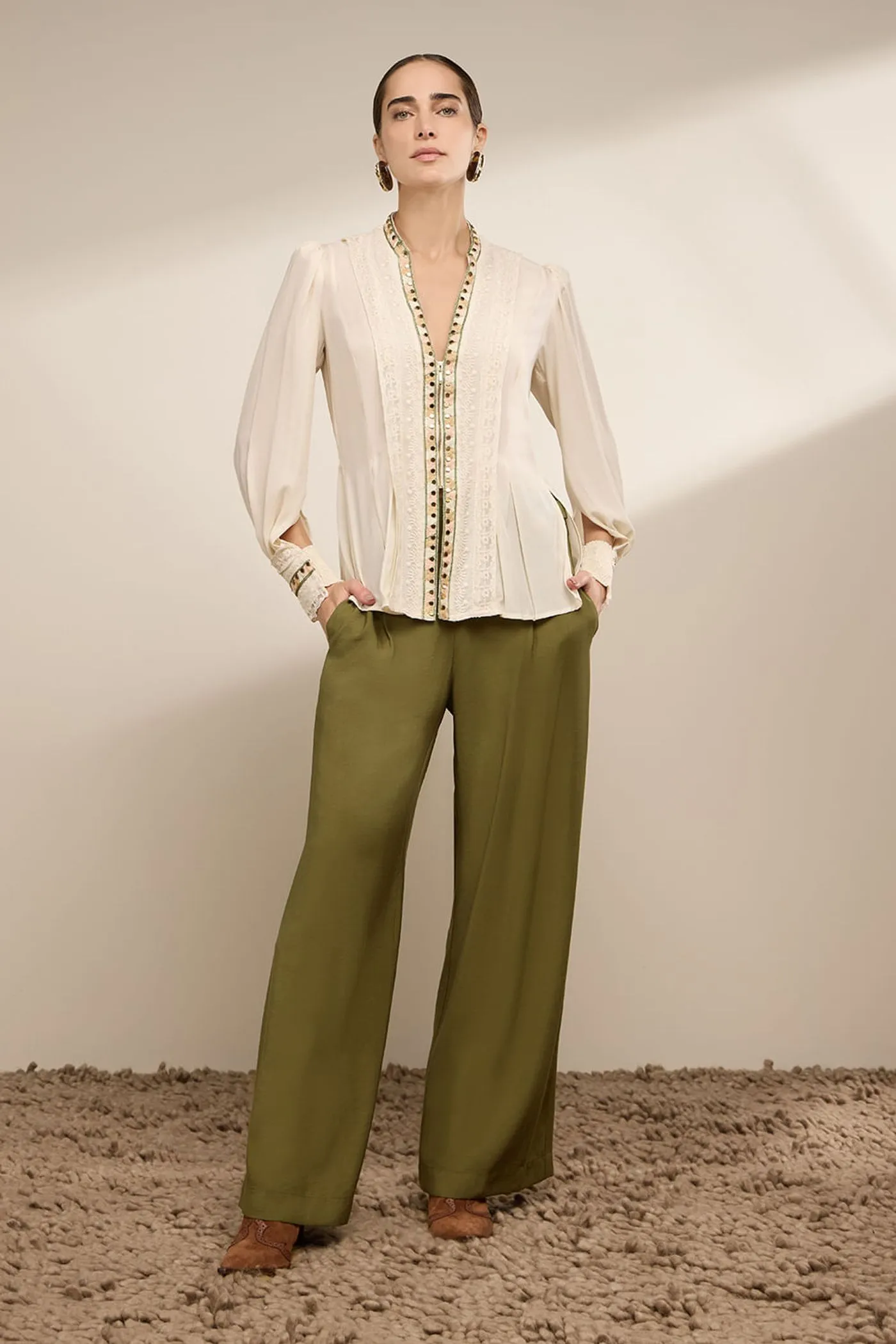 Esta calça é feita para quem busca elegância com conforto. A cor verde oliva combina facilmente com tons neutros e acessórios diferentes. A cintura alta é ideal para destacar a parte mais fina do corpo, e os botões dourados trazem charme e um toque de luxo discreto. A modelagem garante um ajuste perfeito sem apertar.