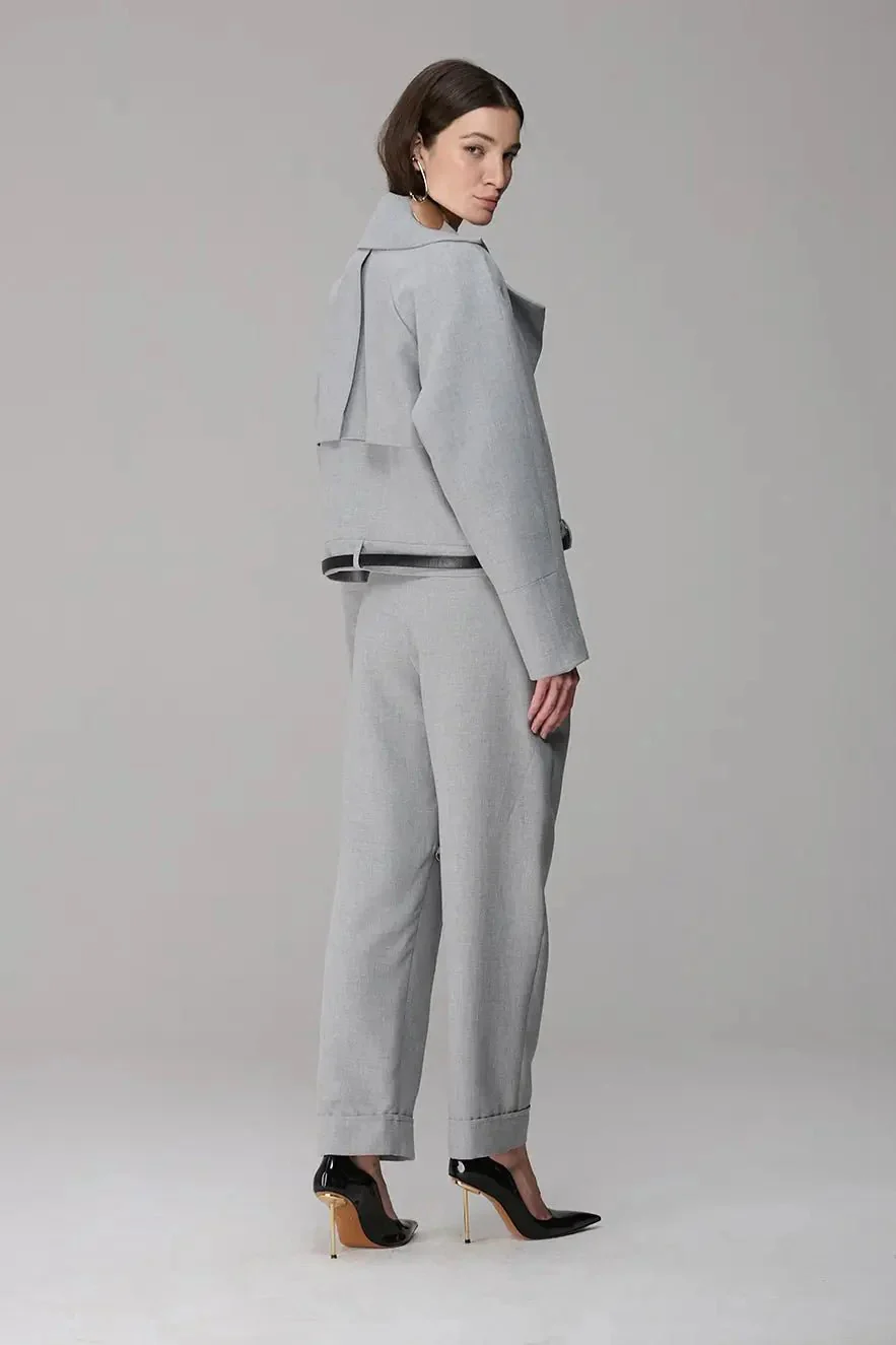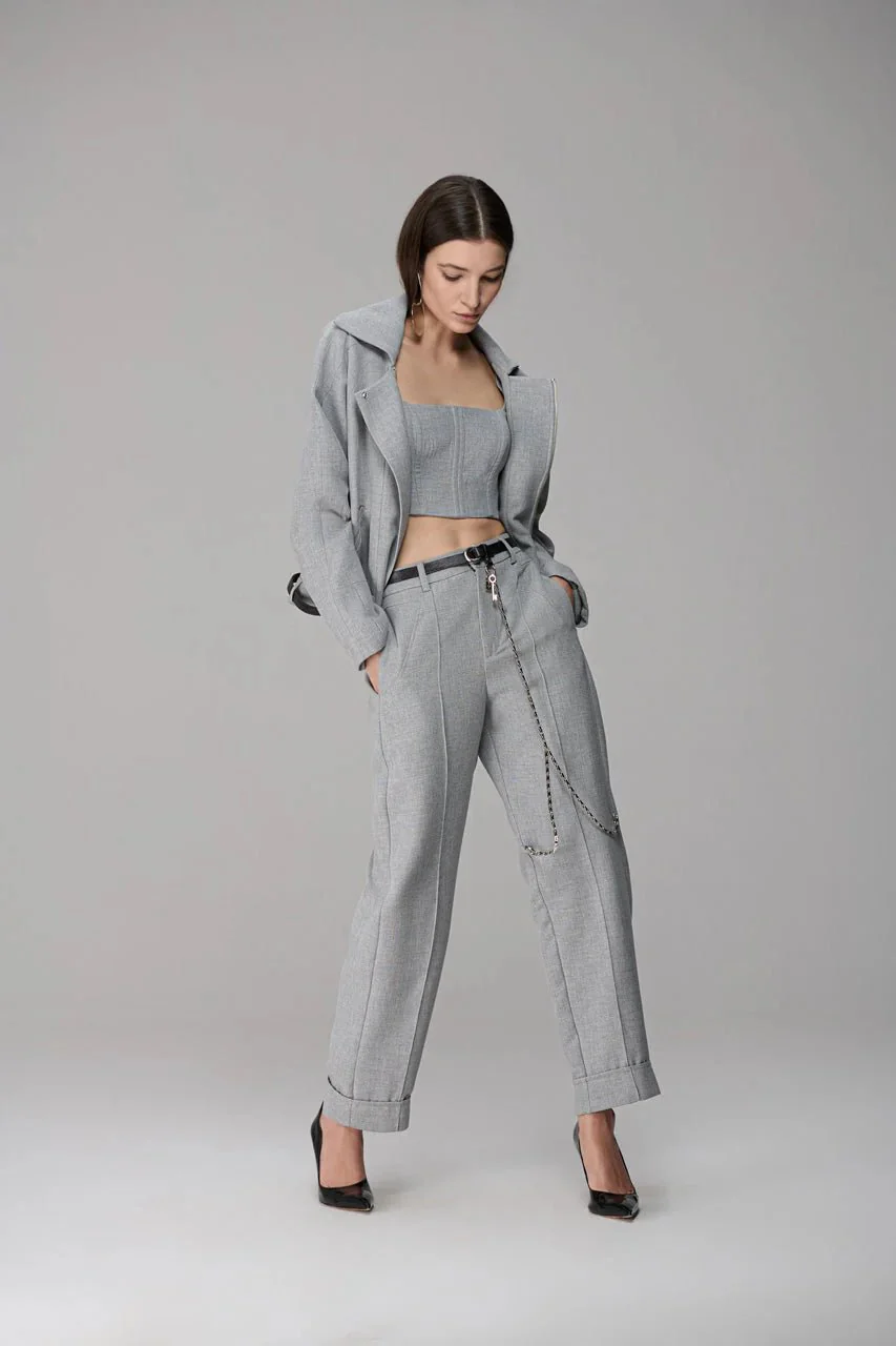 Calça estruturada com modelagem reta e cintura alta, destacando elegância e estilo. A peça acompanha cinto fino em couro com pingente em metal, que conecta uma corrente bifurcada a aros na perna.