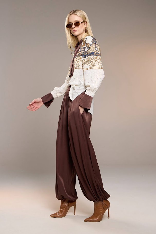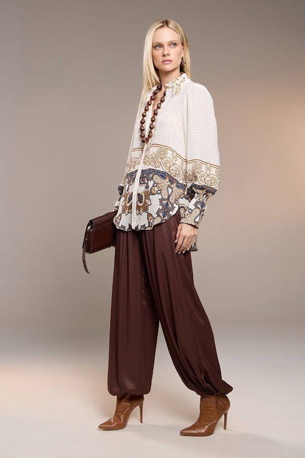 Calça Aladin Cetim Thamara Capelão - A Calça Cetim Thamara Capelão traz estilo e conforto com seu tecido barolo que valoriza o movimento do corpo, além do cós em lastex para ajuste perfeito. Produzida em cetim, a calça oferece toque suave, com cós elástico que facilita o vestir e barras ajustáveis para melhor caimento. Ideal para combinações casuais e looks contemporâneos com conforto e estilo.