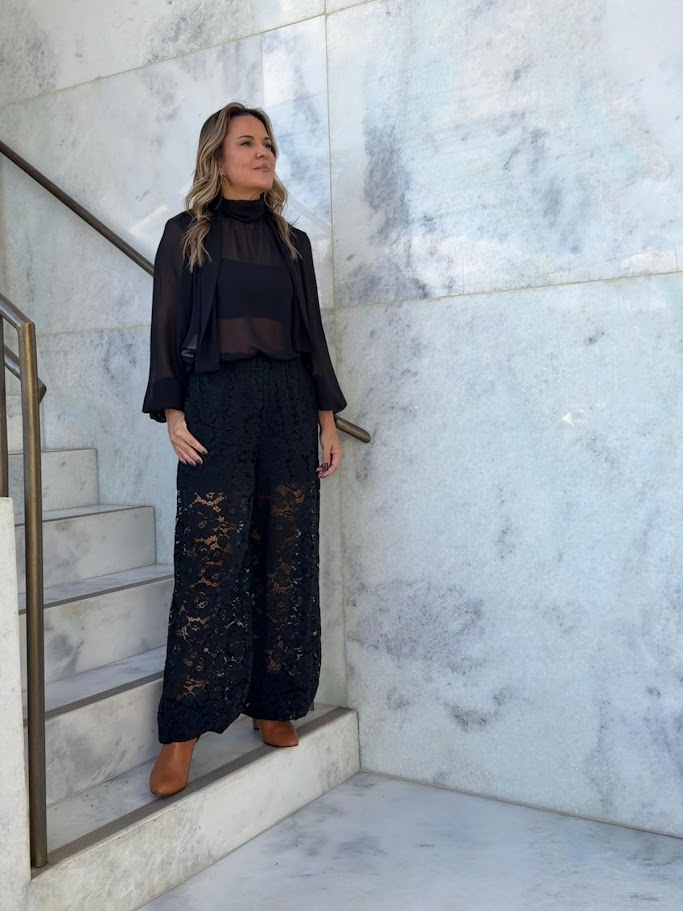 Calça de Renda Balloon Skazi - Calça feminina em renda com caimento balloon e forro curto para conforto mesmo com transparência. A calça é feita em renda preta, com forro curto que cobre apenas parte das pernas, dando efeito transparente nas demais áreas. A modelagem balloon oferece volume e um toque contemporâneo ao visual. Ótima para quem busca peça versátil para ocasiões especiais.