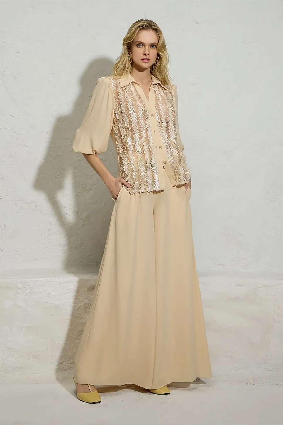 Calça Pantalona Petit Thamara Capelão - Com caimento leve e toque suave, a calça pantalona em tom bege é forrada e oferece movimento elegante a cada passo. A silhueta alongada e o acabamento fluido valorizam a proposta clean e versátil, perfeita para o frescor que acompanha os dias mais longos do verão 2026. Para um visual sofisticado sem esforço, aposte na combinação com camisas soltinhas ou tops delicados, ideal para ocasiões diurnas que pedem charme e leveza de almoços a eventos informais ao ar livre.