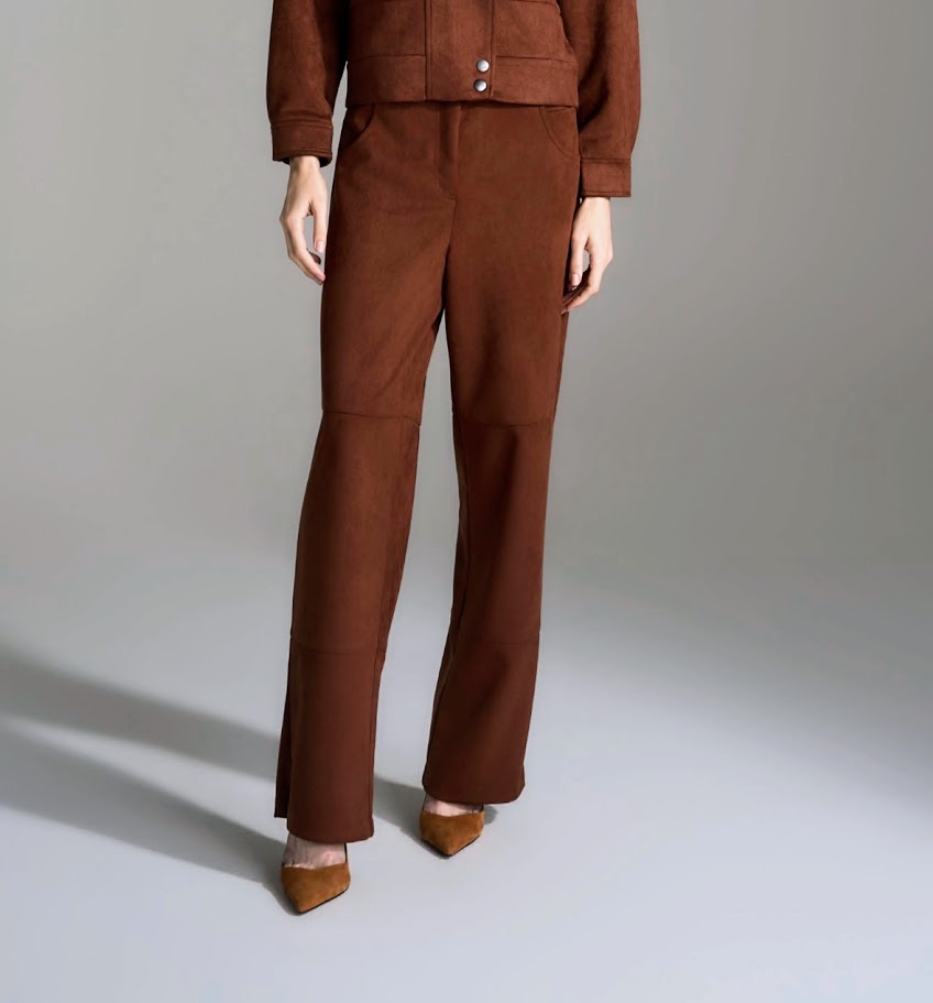 Calça feminina em suede que une conforto e estilo com acabamento suave e toque macio. Ideal para compor looks elegantes e versáteis no dia a dia ou eventos mais sofisticados.
