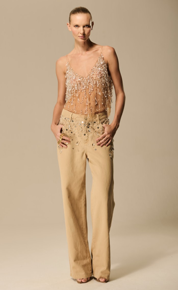 Calça Wide Leg Sarja Bordado Cristal Caos Moda - A calça wide leg de sarja apresenta um caimento amplo e sofisticado, com uma estrutura leve que valoriza o movimento. O tom realça o trabalho artesanal do bordado de cristais aplicado na região do cós e descendo suavemente pelas pernas, criando um brilho elegante sem exageros. O contraste entre a textura rústica da sarja e o brilho delicado dos cristais traz um equilíbrio moderno e refinado, resultando em uma peça que se destaca pela originalidade e pela sensação de luxo discreto.