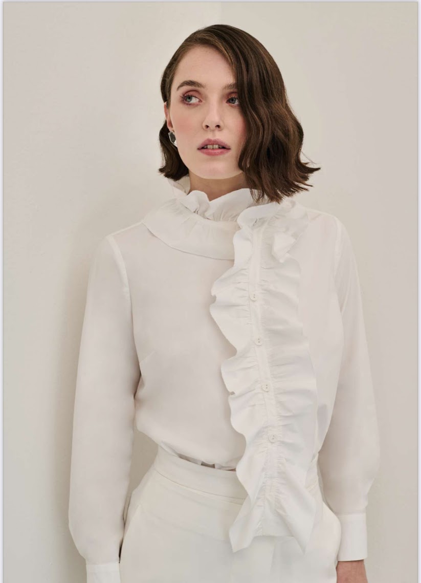 Camisa Feminina Tricoline Jabour 613 Oficial - Elegante e cheia de personalidade, esta camisa feminina é confeccionada em tricoline de alta qualidade, oferecendo toque macio e ótimo caimento. O destaque fica por conta do babado frontal amplo, que adiciona charme e sofisticação ao visual. O babado é solto, mas acompanha toda a linha de abotoamento da camisa, cobrindo delicadamente os botões frontais e criando um visual refinado e romântico.A peça possui gola alta com babado delicado e punhos com fechamento por botão, reforçando a estética clássica e atemporal.