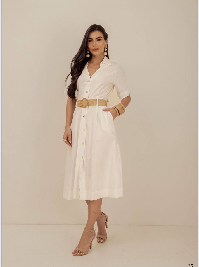 Chemisier Gola e Decote Zione Brand - Chemisier midi em viscolinho, com modelagem levemente acinturada e caimento fluido. Possui gola lapela, mangas curtas e fechamento frontal por botões, que trazem um toque clássico e elegante. Acompanha cinto com fivela encapada em palha, valorizando a cintura e acrescentando um charme natural à produção.Versátil e sofisticado, é a escolha ideal para ocasiões casuais elegantes, almoços e encontros diurnos. Combine com sandálias ou espadrilles para um look leve e atemporal.