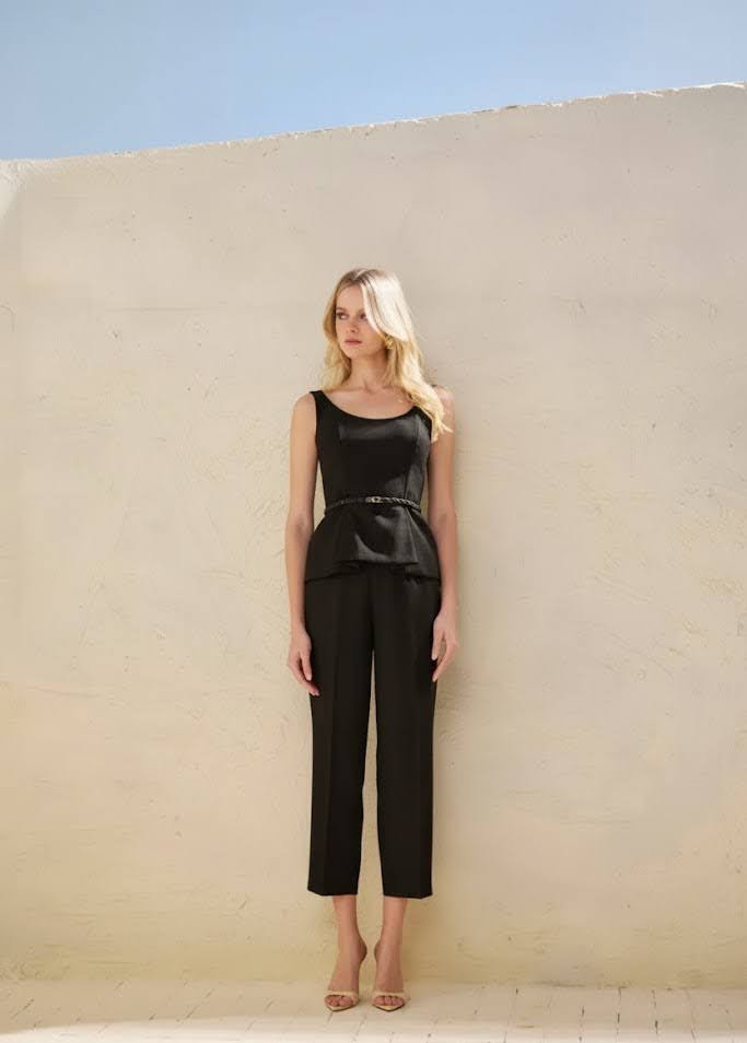 Conjunto Alfaiataria Modern Skunk Brasil - Este conjunto elegante e sofisticado é composto por blusa sem mangas de tecido leve, com decote redondo e modelagem peplum, que valoriza a silhueta feminina. O detalhe do cinto fino com fivela metálica marca a cintura, trazendo um toque refinado ao visual. A calça de corte reto e cintura alta complementa o look com um ar contemporâneo, ideal para compor produções versáteis, tanto para ocasiões formais quanto eventos casuais elegantes.