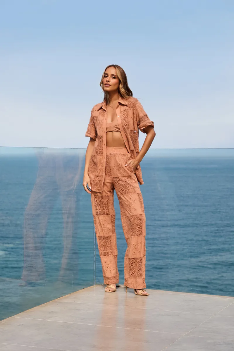 O bordado delicado em toda a superfície do tecido confere charme artesanal e um visual elegante, ideal para produções de verão, viagens ou ocasiões casuais sofisticadas.