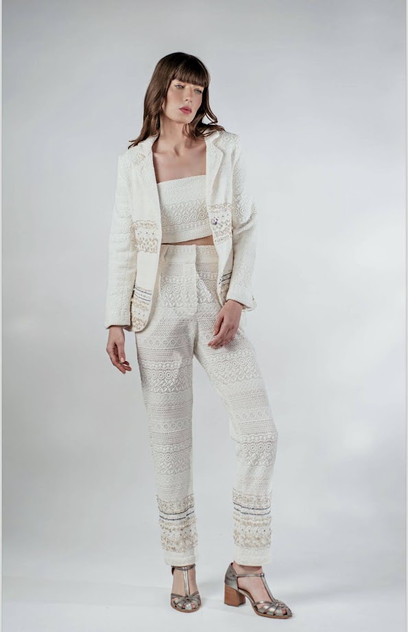 Conjunto Blazer Bordado Três Peças Amitee - O conjunto é composto por peças feitas de forma muito delicada e manual, possuem detalhes primorosos e enobrecedores. O blazer possui bordado de miçangas e pedrarias na parte da frete, cropped com alças finas e fechamento por zíper na parte de trás, a calça possui bolsos faca nas laterais, fechamento por engate e zíper frontal e bordado manual de miçangas na barra.