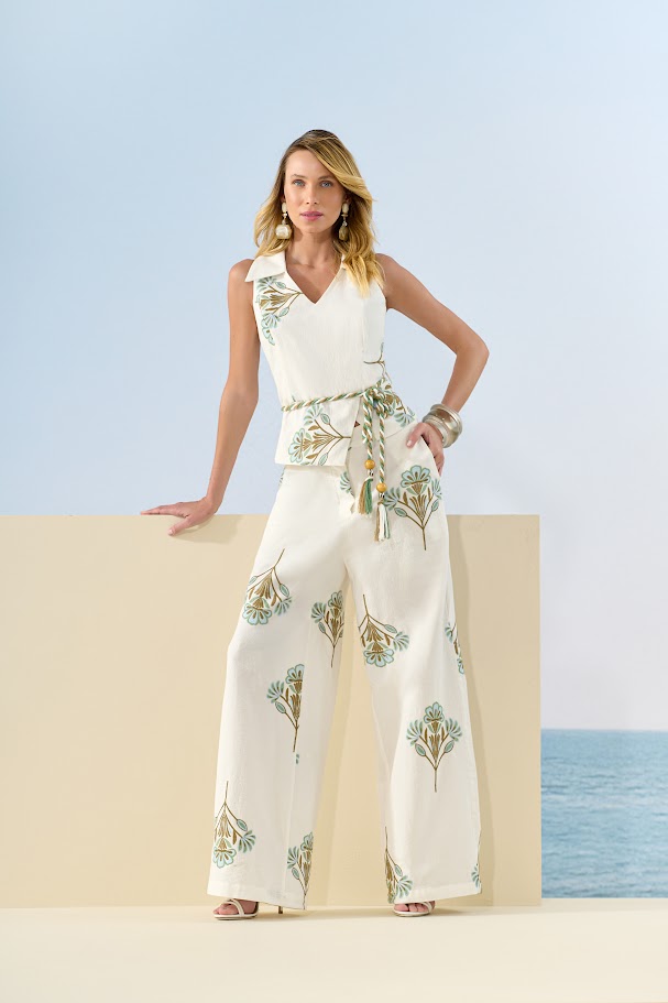 Delicado e sofisticado, este conjunto da Cléo Oficial traduz frescor e elegância. A blusa sem mangas possui gola com lapela, decote em V e aplicação de bordados florais sutis, trazendo um toque artesanal e exclusivo. A amarração na cintura com cordão trançado e tassels adiciona charme e valorização da silhueta. A calça pantalona, com modelagem ampla e confortável, também recebe bordados estratégicos que criam harmonia com a parte superior. Confeccionado em tecido leve e de excelente caimento, é ideal para ocasiões que pedem leveza, estilo e sofisticação.