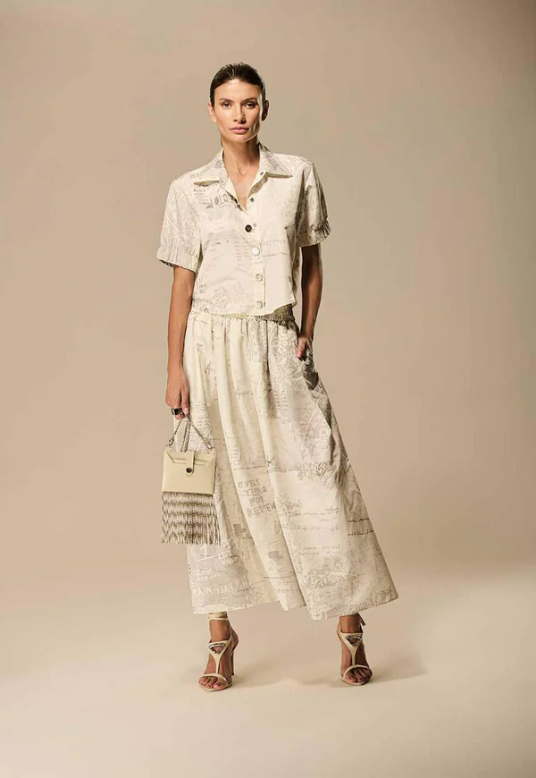 Conjunto Camisa Cropped e Saia Estampa Liberté Caos Moda - Delicado e cheio de personalidade, o conjunto aposta em um visual romântico com toque contemporâneo. A camisa cropped com botões frontais e gola clássica traz estampa exclusiva com referências manuscritas, que adicionam charme e autenticidade à peça. Já a saia midi, de cintura alta e caimento fluido, equilibra leveza e sofisticação com sua silhueta soltinha e pregas sutis. Um look versátil e encantador para os dias em que estilo e conforto caminham juntos.