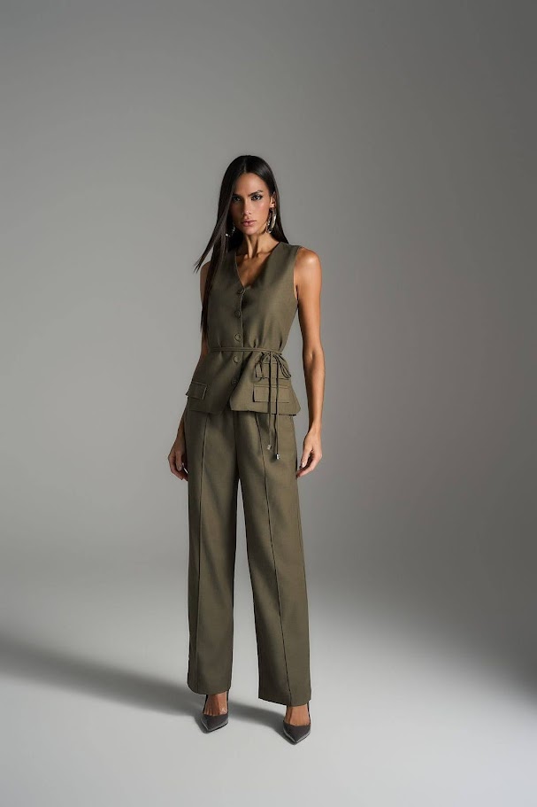 O conjunto é composto por Colete sem mangas com detalhes sutis e calça reta com caimento fluido. A cor verde oliva, que traz sofisticação discreta. Ideal para quem busca aliar moda e bem-estar em uma peça versátil e prática.