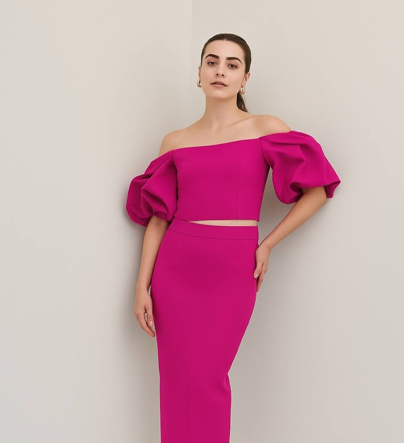 Um conjunto que une elegância e conforto: saia longa e cropped com mangas bufantes para destaque no visual.