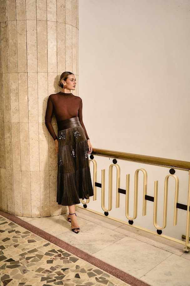 Saia midi em veludo com caimento fluido e bordado artesanal em paetês e vidrilhos, para quem busca elegância com conforto.