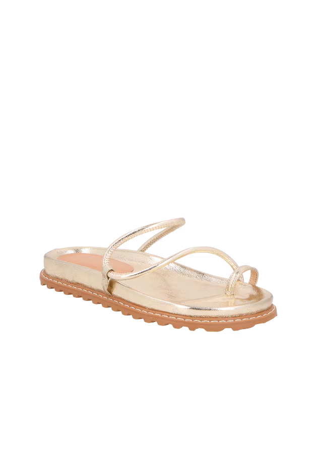 Sandália Papete de Dedo Tratorada Metalizada Luiza Barcelos - Papete de dedo com tiras finas assimétricas em material tecnológico metalizado, que adiciona brilho sofisticado e toque contemporâneo. O solado tratorado oferece conforto e aderência, enquanto o design minimalista das tiras traz leveza e modernidade ao visual.