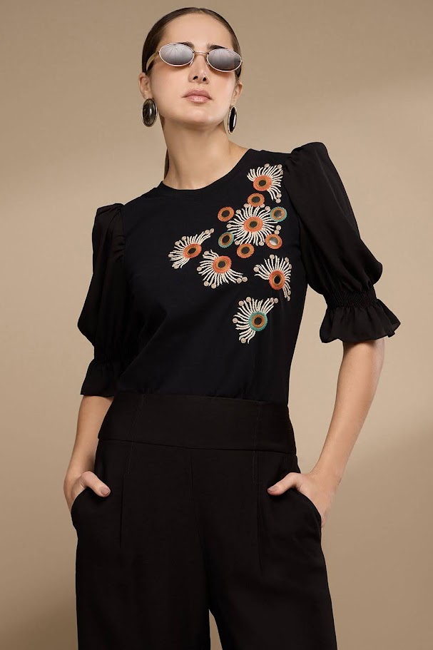 Esta t-shirt da Thamara Capelão oferece um toque de elegância com sua bordado detalhado em flores coloridas na parte frontal. Confeccionada com tecido confortável e mangas estilo princesa que valorizam o visual.