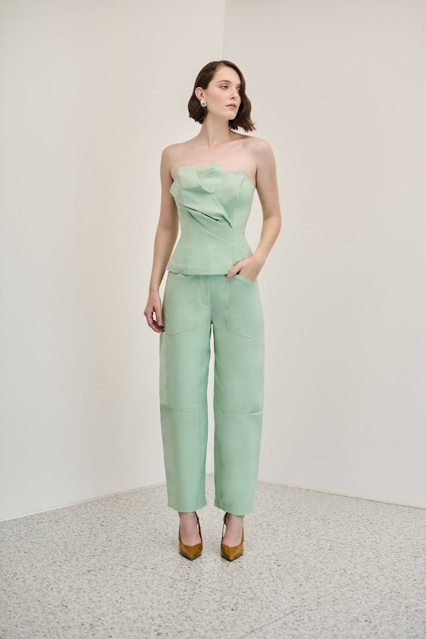O top verde água da 613 Oficial é a escolha ideal para quem busca modernidade e sofisticação em uma única peça. Confeccionado em sarja 100% algodão, traz caimento impecável e modelagem estruturada, com detalhe drapeado no busto que garante charme escultural e um visual diferenciado.