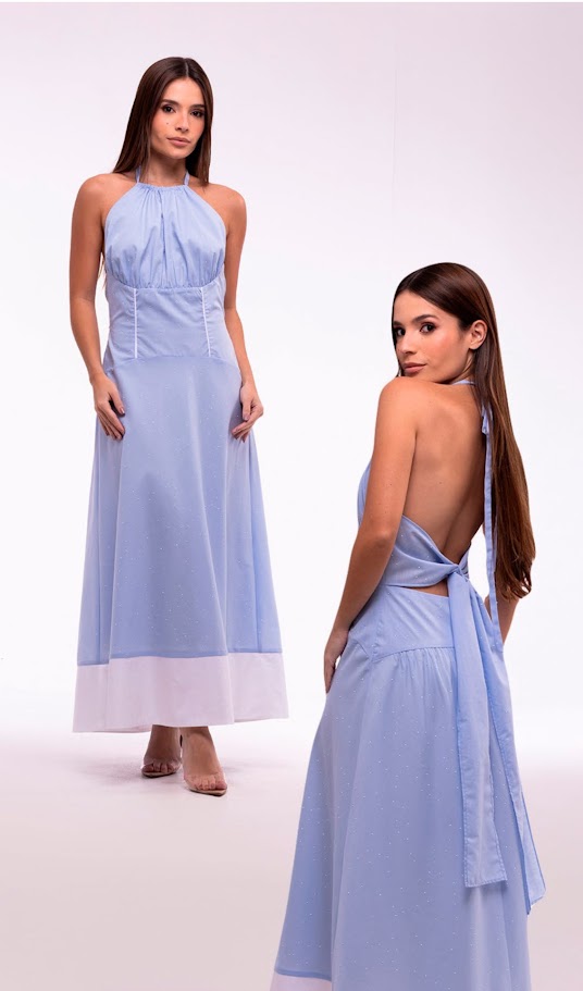 O modelo possui costas abertas com amarração ajustável e faixa larga que realça a cintura, trazendo feminilidade e sofisticação ao visual. A saia longa com leve evasê e barra contrastante em tom off-white garante movimento e charme à produção.