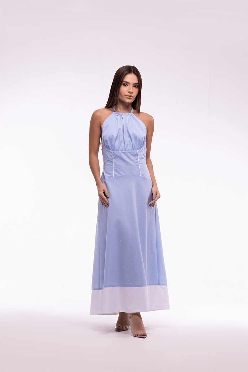 Vestido Skunk Brasil na cor baby blue, confeccionado em tecido leve e fluido com leve brilho acetinado. A peça apresenta decote halter com amarração no pescoço, que valoriza o colo de forma elegante, e recortes anatômicos que proporcionam ótimo caimento.