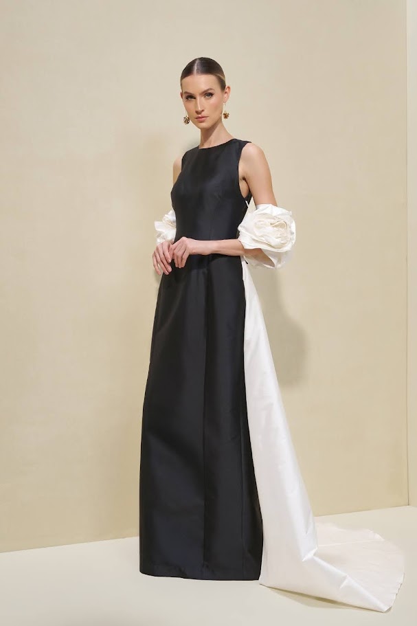 Vestido Bicolor Mangas de Rosas Fleche D'or - Vestido longo confeccionado em zibeline estruturado, apresentando design bicolor em preto e off-white que traduz elegância contemporânea. O modelo possui corte reto, decote fechado e costas lisas, garantindo um caimento impecável e sofisticado. O destaque fica por conta das mangas volumosas removíveis em formato de rosas e da cauda dramática em tom claro, que adiciona movimento e imponência ao visual. Uma peça impactante e refinada, ideal para eventos formais, jantares de gala e ocasiões que pedem presença marcante e estilo exclusivo.