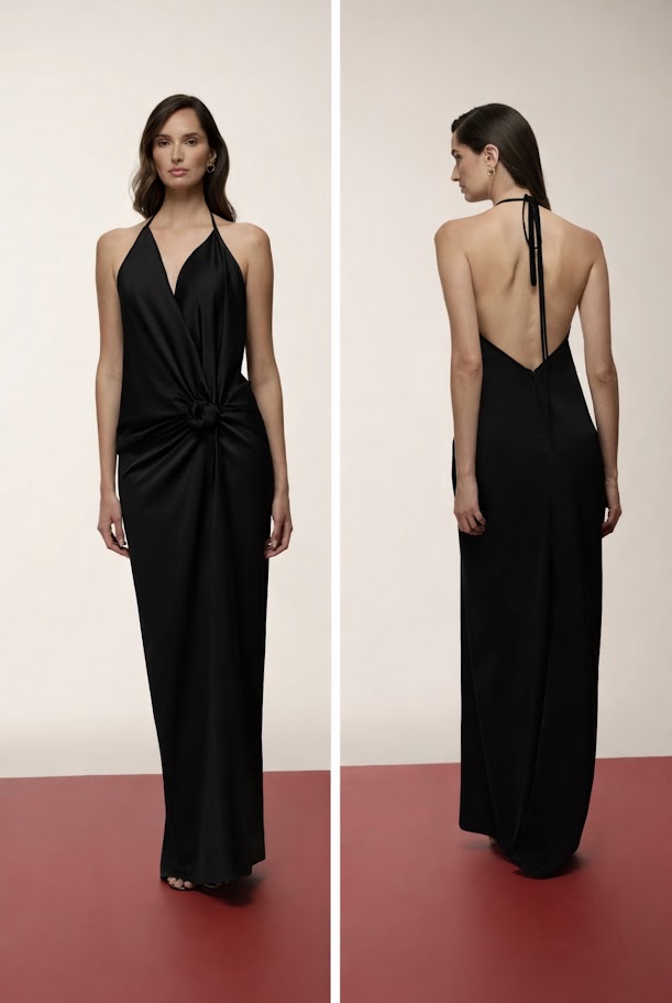 Elegância e estilo para suas ocasiões especiais com este vestido longo em cetim preto.