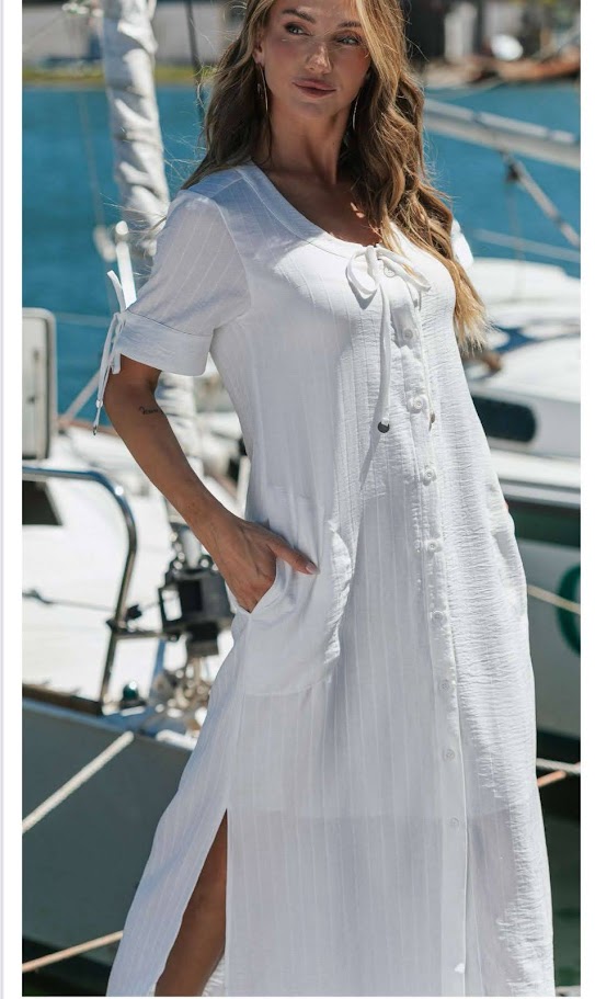 tecido leve e arejado, este vestido proporciona frescor nos dias quentes sem abrir mão do estilo sofisticado. Com modelagem chemise clássica, ele possui botões frontais, mangas curtas e uma delicada amarração no decote, que traz charme extra ao look. O design alongado com fendas laterais garante liberdade de movimento e modernidade na produção.