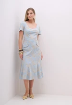 Vestido Crepe bordado Marcia Morais - Vestido Midi Bordado azul serenity com floral bege. Decote quadrado, modelagem evasê e bolsos funcionais. Elegância romântica e versátil para todos os dias.