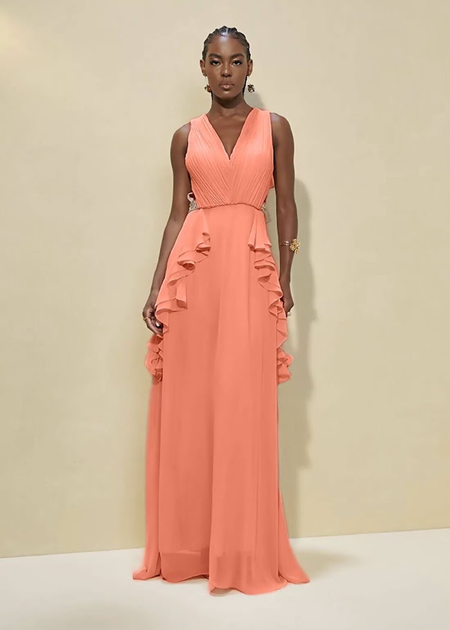 Vestido Drapeado com Recortes Fleche D'or - Vestido longo confeccionado em chiffon leve, com caimento fluido e movimento elegante. O modelo possui decote em V, recortes laterais sutis que valorizam a cintura e detalhe com aplicação delicada de brilho, criando um toque sofisticado. As saias com camadas e babados verticais acrescentam volume e charme, proporcionando um visual feminino e refinado. Ideal para festas, casamentos e eventos especiais, o vestido combina conforto e elegância em uma tonalidade coral suave que realça a pele e transmite frescor.