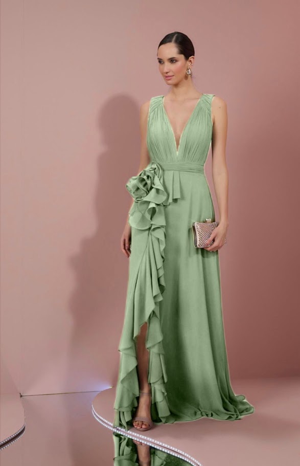 Vestido Longo Festa Corpo Drapeado Fleche D'Or - Vestido longo em tecido leve e fluido, com decote V profundo e recorte na cintura que valoriza a silhueta. O modelo apresenta babado estruturado em uma das alças, trazendo um toque de sofisticação e movimento. A saia ampla com fenda frontal adiciona elegância e modernidade ao look. Ideal para eventos formais, o vestido combina perfeitamente com acessórios metalizados e penteados presos. Destaque para a cor verde-água, delicada e contemporânea, perfeita para ocasiões especiais.