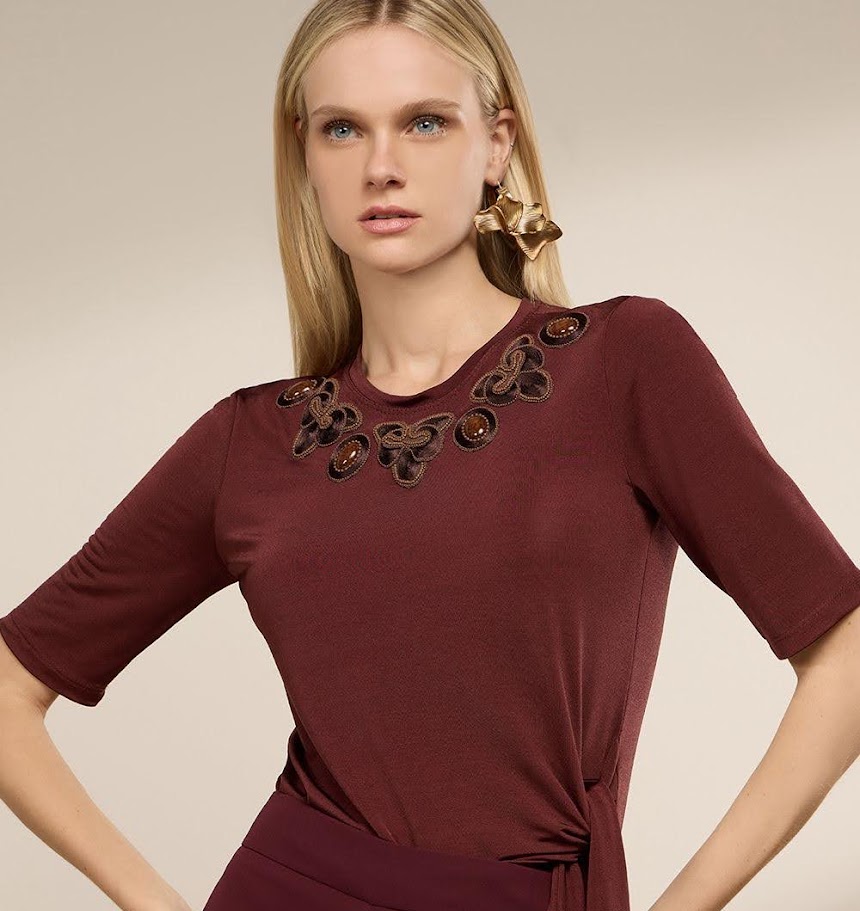 Vestido longo em malha confortável com detalhe franzido na cintura e apliques decorativos no decote, ideal para ocasiões que pedem elegância com praticidade.