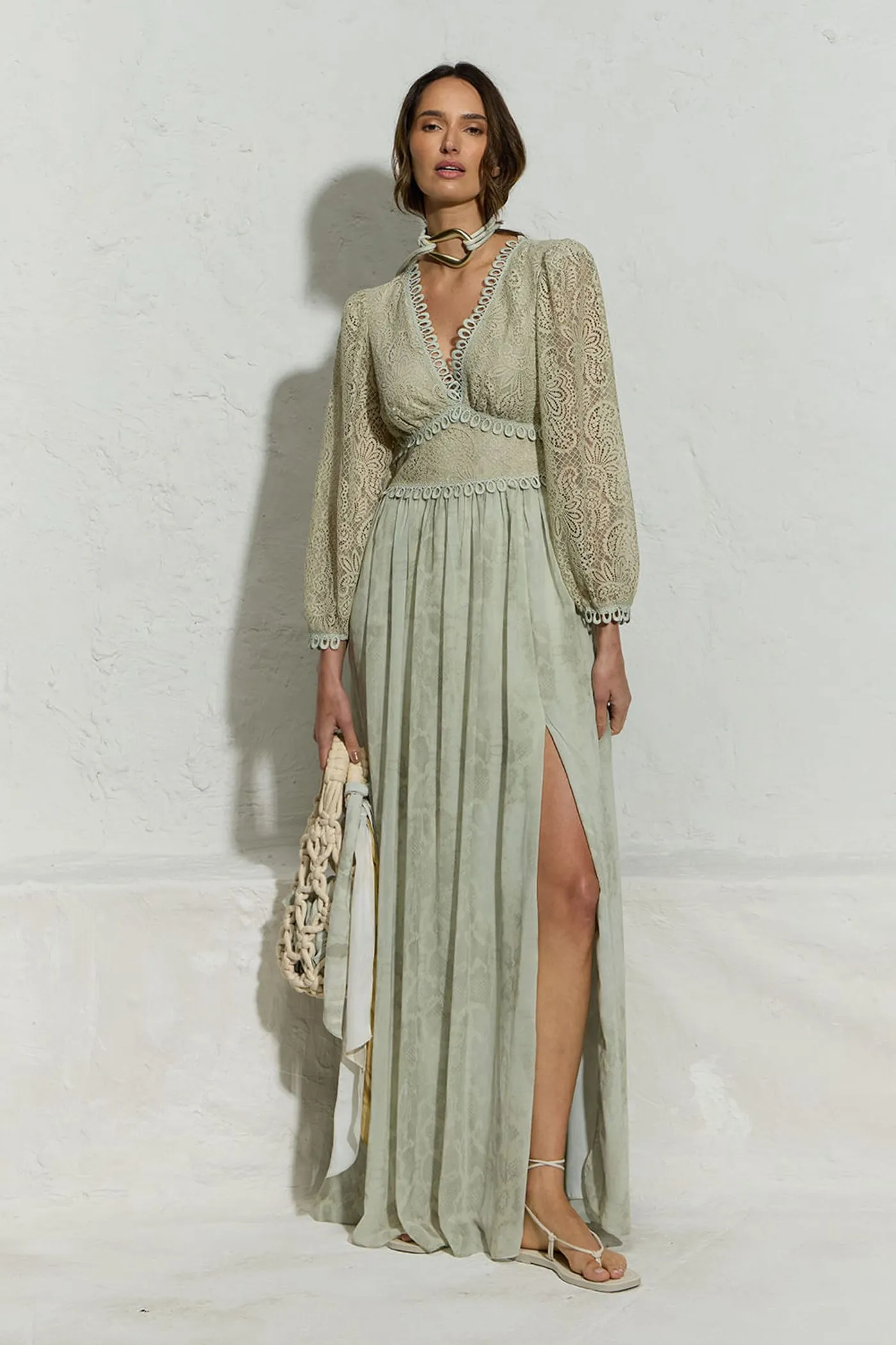 Vestido Manga Longo Festa Com Renda Thamara Capelão - Com acabamento delicado e uma combinação encantadora entre renda e tecido fluido, o vestido longo light green envolve o corpo com suavidade e leve transparência. A parte superior é marcada pelo busto com renda trabalhada e decote em V contornado por guipir, enquanto a manga levemente bufante adiciona romantismo. A saia dupla com abertura frontal e forro estampado reforça a leveza e o movimento, criando uma silhueta elegante com o conforto do lastex nas costas. Ideal para ocasiões especiais à luz do dia ou eventos ao ar livre, combine com sandálias de salto e acessórios em tons neutros para uma proposta sofisticada e fresca para o verão 2026.