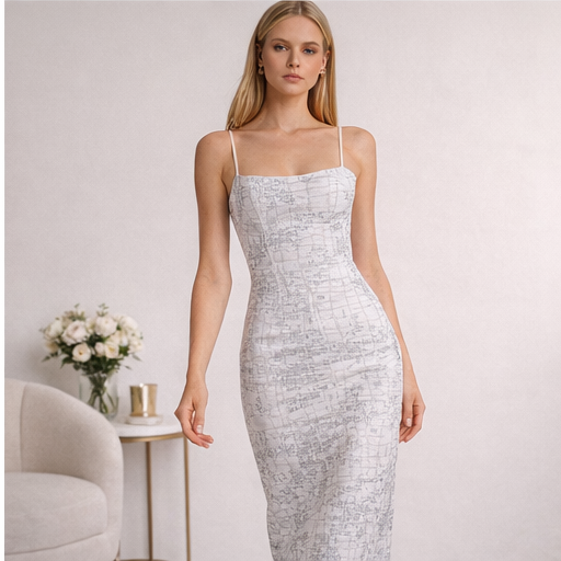 O vestido tem comprimento midi, alças finas estilo spaghetti e estampa inspirada em pele de crocodilo, mas com toque moderno e urbano. Possui forro interno para conforto e evitar transparências, garantindo praticidade ao usar. Tranfer aplicado no vestido todo.