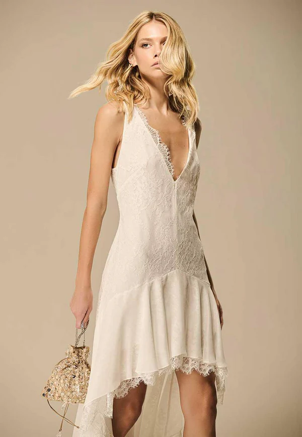 Elegante e delicado, este vestido mullet combina o romantismo da renda com a fluidez da modelagem assimétrica. O decote em V é valorizado por um acabamento rendado, enquanto a saia em camadas, mais curta na frente e alongada atrás, proporciona movimento e leveza à produção. Um modelo versátil que transita bem entre eventos diurnos e noturnos com charme e sofisticação.
