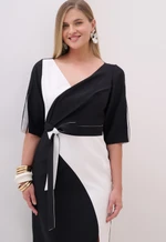 Vestido Preto e Branco Marcia Morais - Vestido Branco e Preto midi, com decote V e fenda na manga. Elegância clássica em crepe com toque de seda para eventos e trabalho, do dia à noite.